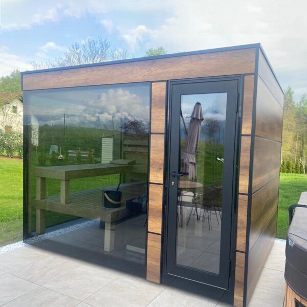 Erleben Sie pure Entspannung mit der Zermatt-Medium Outdoor-Sauna. Dank des integrierten Vorraums und der großzügigen Glasfront wird Ihr Garten zur luxuriösen Wellness-Oase. Perfekt, um Körper und Geist zu erfrischen und neue Energie zu tanken.