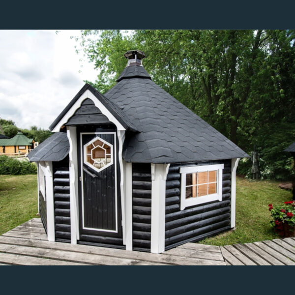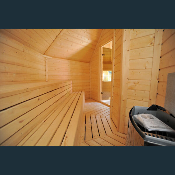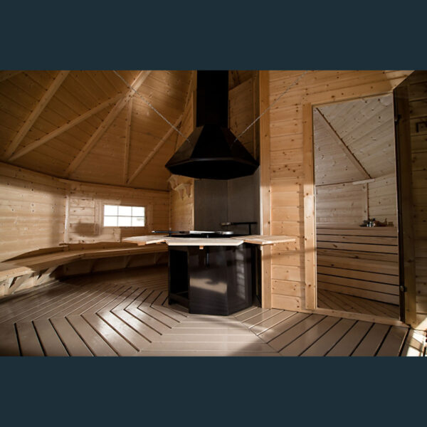 Der Loungebereich ist mit drei Bänken ausgestattet, die mit speziell entworfenen Kissen bedeckt sind. Es hat einen bequemen Holz- oder Holzkohlegrill mit einem Tisch und einem Kamin über dem Grill. Der Lounge-Bereich ist von der Sauna durch eine hitzebeständige Glastür getrennt. In der Sauna gibt es zweistöckige, breite Saunabänke. 8-14 Personen können darin zusammen saunieren.