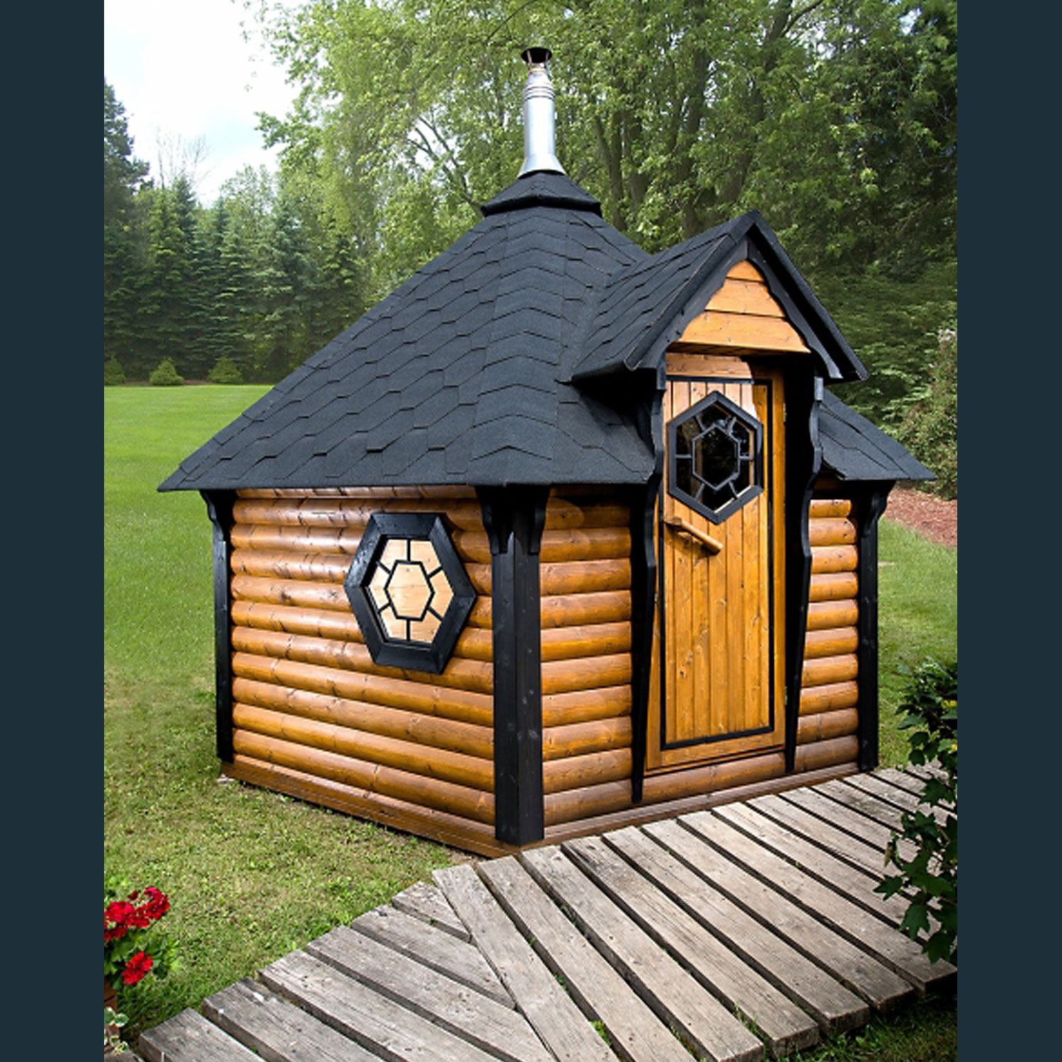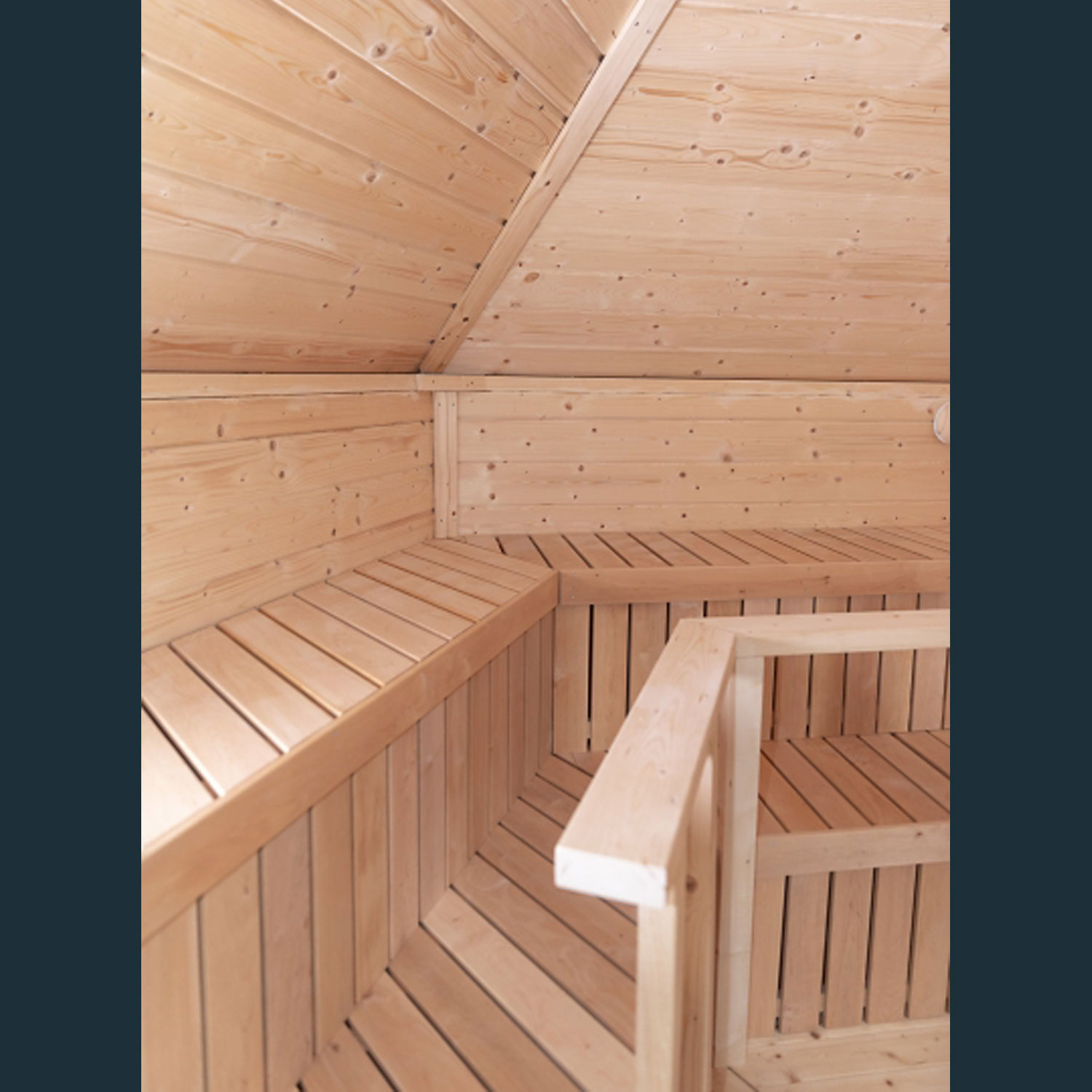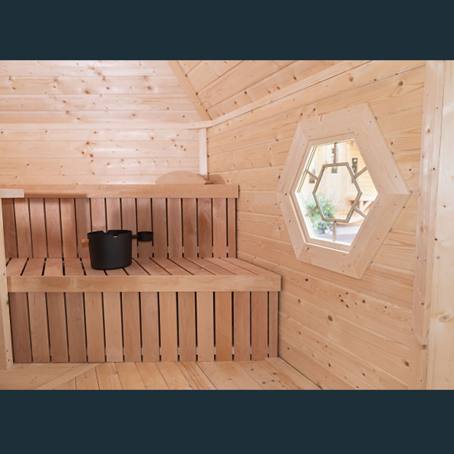 Die Kabine besteht aus sechs Dachteilen, sechs Wänden (zwei davon mit sechseckigen Doppelglasfenstern), Holztüre und breiten Saunabänken.