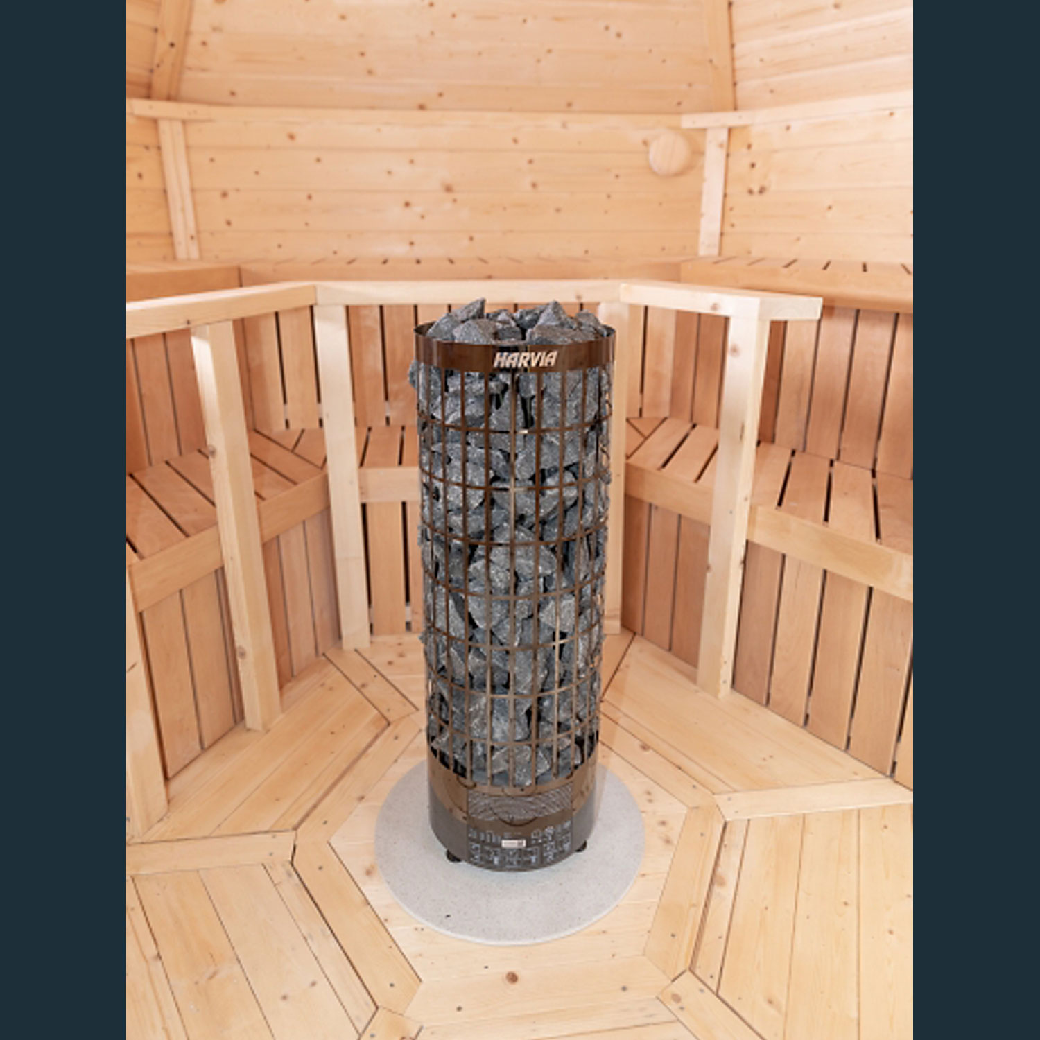 In der Mitte der Sauna befindet sich wahlweise ein elektrischer oder ein Holzofen.